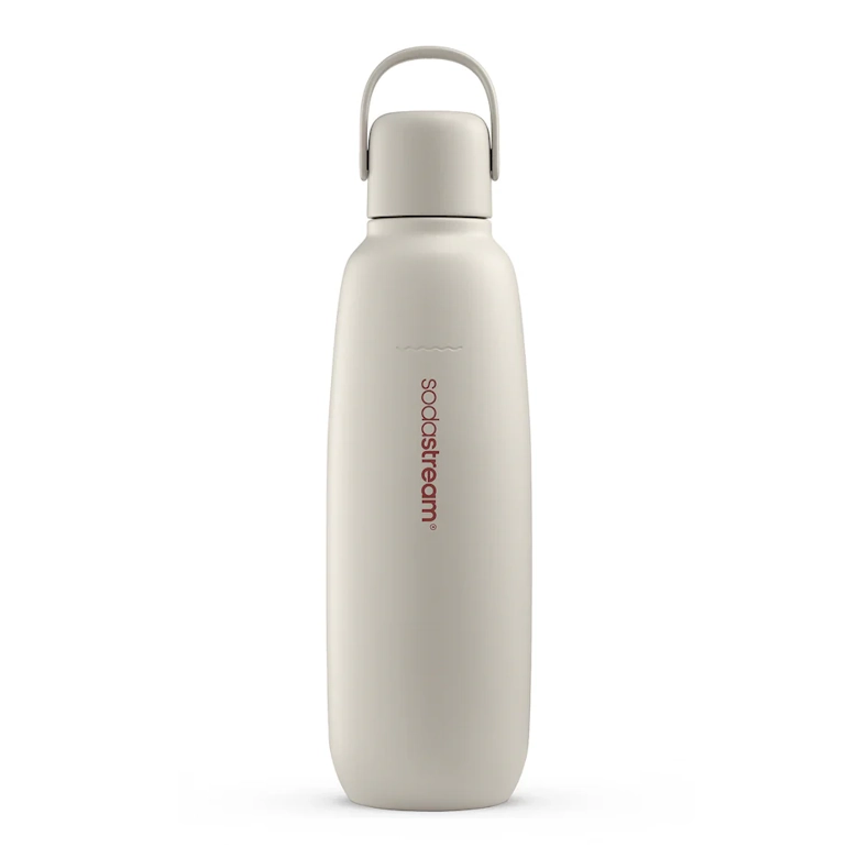 SodaStream 0,9L fizz&go Stainless Steel – iš nerūdijančio plieno pagamintas izoliuotas butelis, kuris išlaiko gėrimo temperatūrą iki 12 valandų. Butelį galima plauti indaplovėje, o minkšta rankena leidžia patogiai jį nešiotis.
